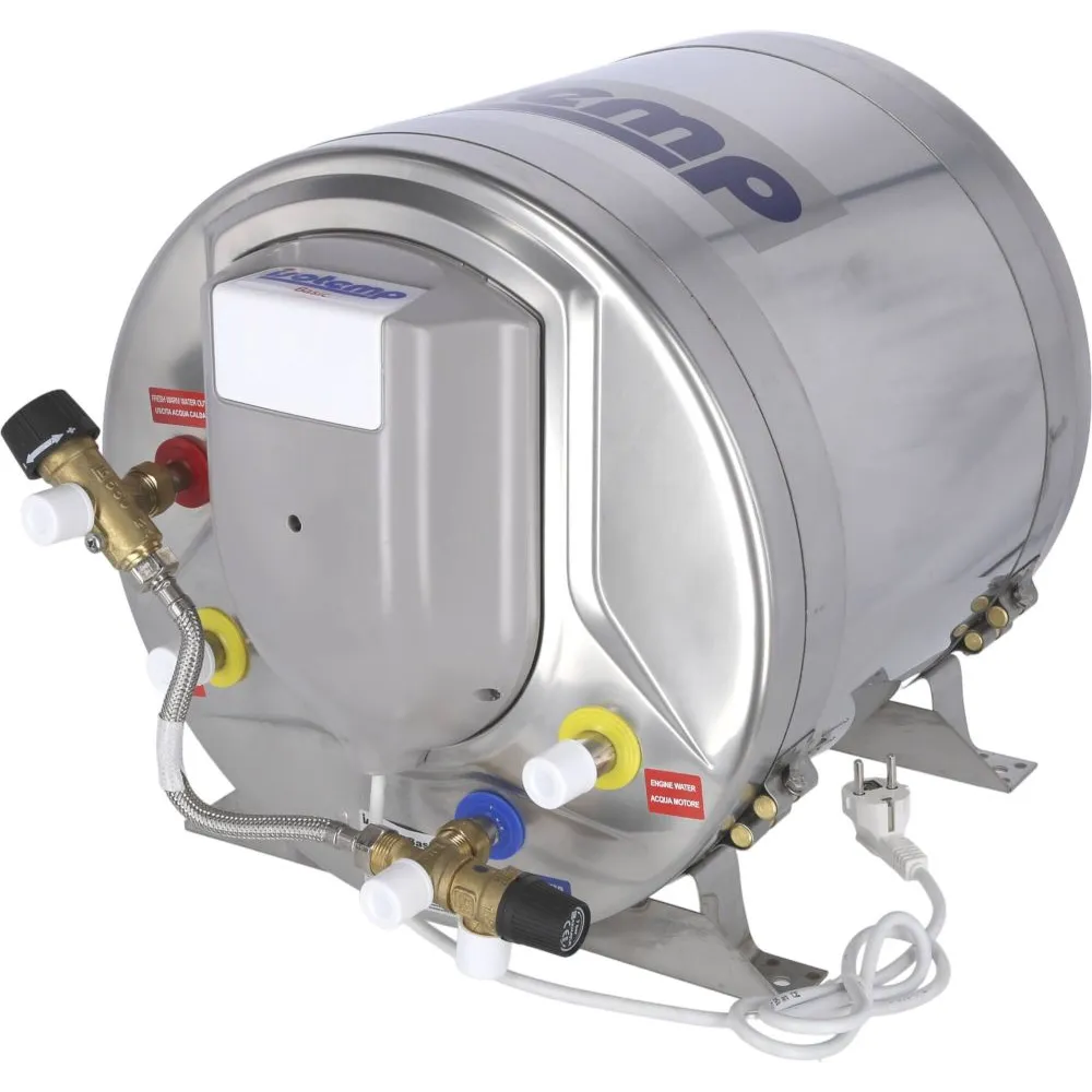 Installation horizontale ou verticale, mitigeur thermostatique et soupape de sécurité 7 bars de série. L’échangeur permet de connecter le chauffe-eau sur un circuit de chauffage à eau ‘’Hydronic’’ et/ou sur le circuit refroidissement du moteur.