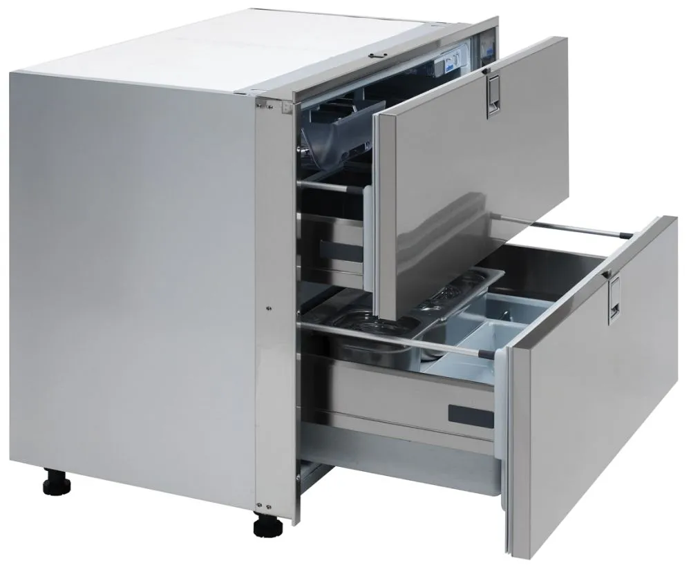 - Réfrigérateurs à tiroirs inox de 16 à 190L avec porte flush alignée avec le cadre d’encastrement