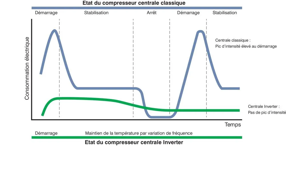 Les centrales à eau glacée Inverter au R410a fonctionnent sur le principe d’un compresseur à vitesse variable contrairement aux centrales à eau glacée conventionnelles qui fonctionnent avec des compresseurs On/Off, « tout ou rien ».