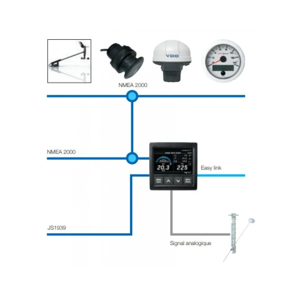 Convertisseur analogique vers NMEA2000 intégré. Branchez des sondes et/ou jauges en analogique (2 entrées capacitives et 2 résistives) et l'OceanLink diffusera les valeurs sur votre réseau NMEA2000, pour affichage sur n'importe quel écran multifonction.