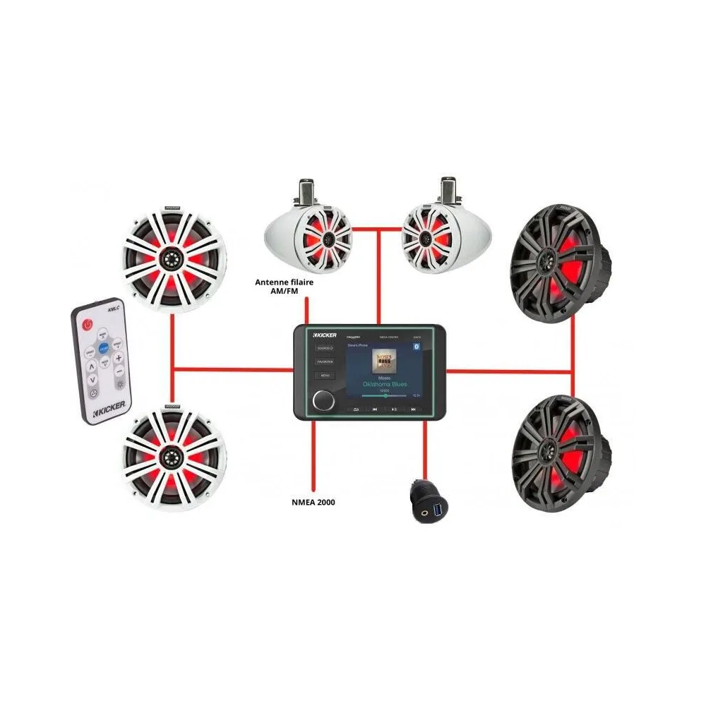 • Source audio multimédia KMC5, écran LCD couleur 3.5'' facilement lisible, molette pour contrôler jusqu'à deux zones audio sur le bateau, puissance de plus de 150 watts.