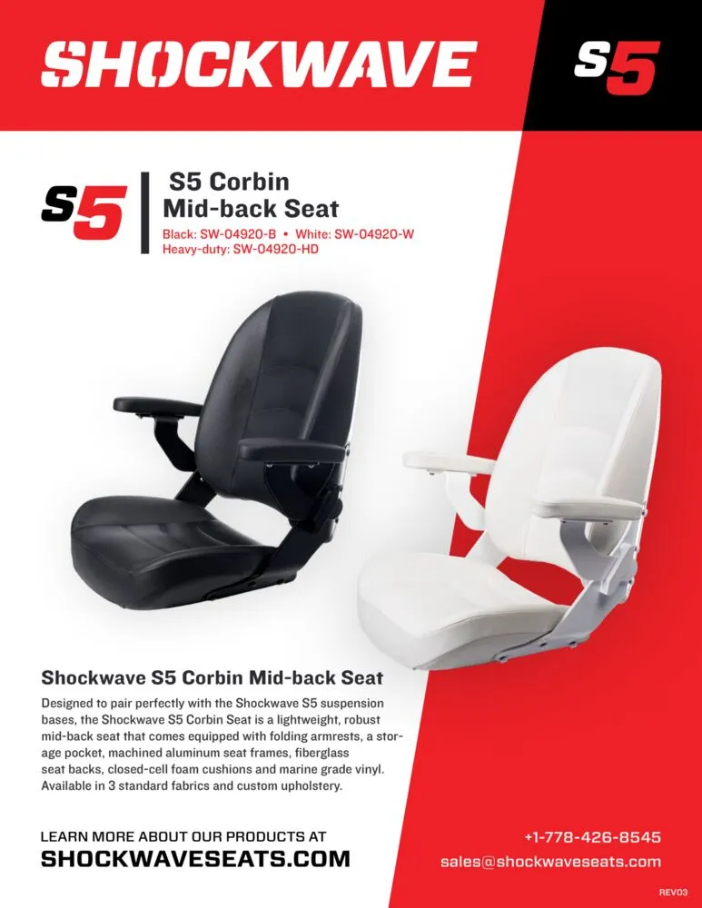 Conçu pour s'associer parfaitement aux bases de suspension Shockwave S5, le siège Mid-Back Shockwave S5 Corbin est un siège de bateau léger et robuste, équipé d'accoudoirs rabattables, d'une poche de rangement, de cadres de siège en aluminium usiné, de dossiers de siège en fibre de verre et de coussins Corbin. Ces sièges dureront plus longtemps que n'importe quel siège marin sur le marché.