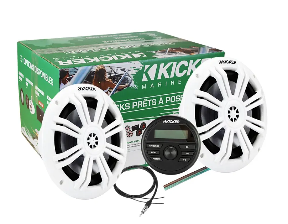 Une solution audio complète et robuste spécialement conçue pour votre bateau. Ce pack "prêt à poser" combine la source compacte KMC2, prévue pour s'insérer dans l'emplacement d'une jauge standard, avec deux haut-parleurs marins de 6.5 pouces. Idéal pour une installation discrète sur le tableau de bord sans compromis sur la qualité sonore Kicker.
