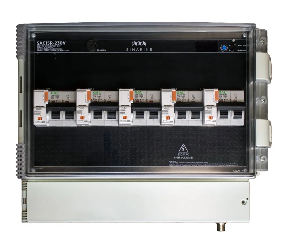 Coffret distribution 230Vac avec 5 disjoncteurs motorisés C20A, shunt de courant 25A entrant, protocoles SiCom et NMEA2K, alimentation 230Vac