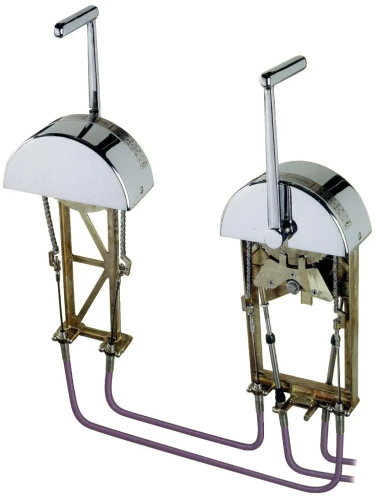 Le corps est réalisé en bronze chromé, la visserie est en acier inoxydable. Chaque levier est bi-fonction, commandant à la fois l’embrayage et l’accélération.